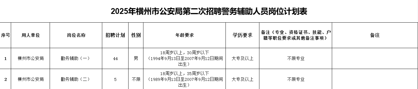 附件1.橫州市公安局2025年度第二次公開(kāi)招聘警務(wù)輔助人員崗位計劃表