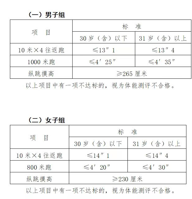體測項目為縱跳摸高、10米×4往返跑和1000米(男)或800米(女)長(cháng)跑,體能測試項目評分標準依據《公安機關(guān)錄用人民警察體能測評項目和標準(暫行)》執行(見(jiàn)附件3),體能測試項目規則按照《公安機關(guān)錄用人民警察體能測評實(shí)施規則》執行(見(jiàn)附件4)。