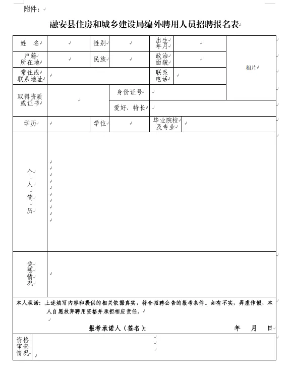 (1)報名方式:應聘者將報名表等相關(guān)材料發(fā)送至融安縣住建局郵箱:raxjsj@163.com,報名材料主要包括:報名表(請自行下載填寫(xiě),并手寫(xiě)簽名)、身份證、學(xué)歷學(xué)位證書(shū)、資格證書(shū)、獲獎證書(shū)等。以上材料均需掃描成PDF版本。