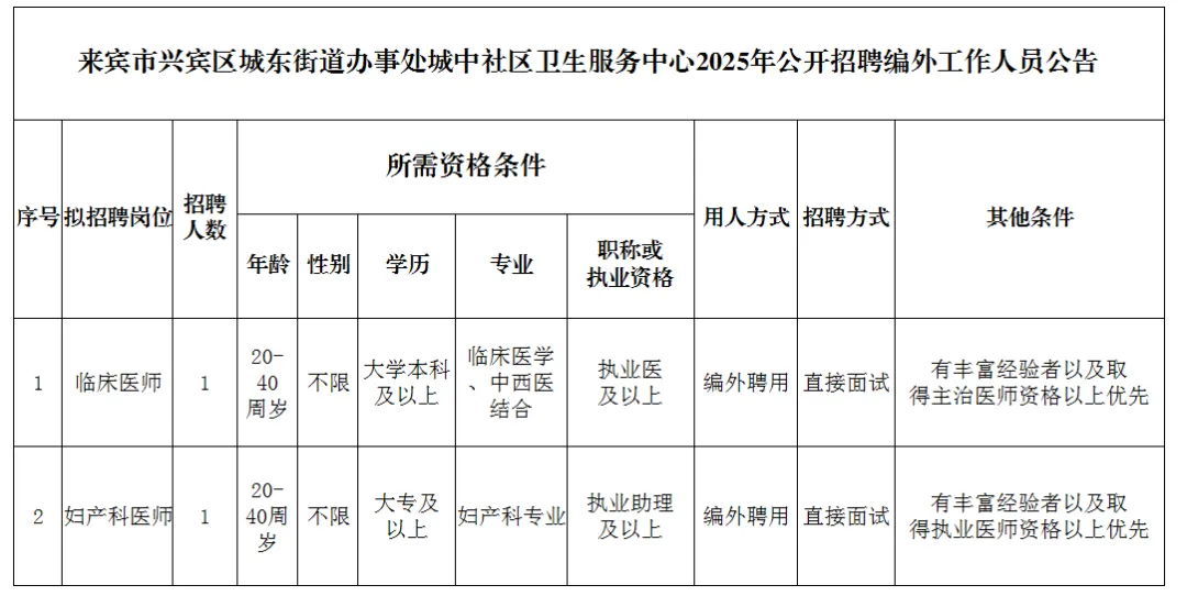 2025年來(lái)賓市興賓區城中社區衛生服務(wù)中心公開(kāi)招聘編外工作人員公告