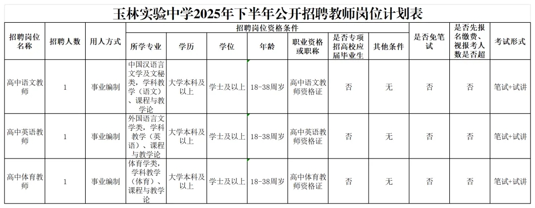 具體招聘信息請瀏覽玉林市人社局網(wǎng)站相關(guān)公告,以《玉林市2025年下半年公開(kāi)招聘中小學(xué)幼兒園教師公告》為準。