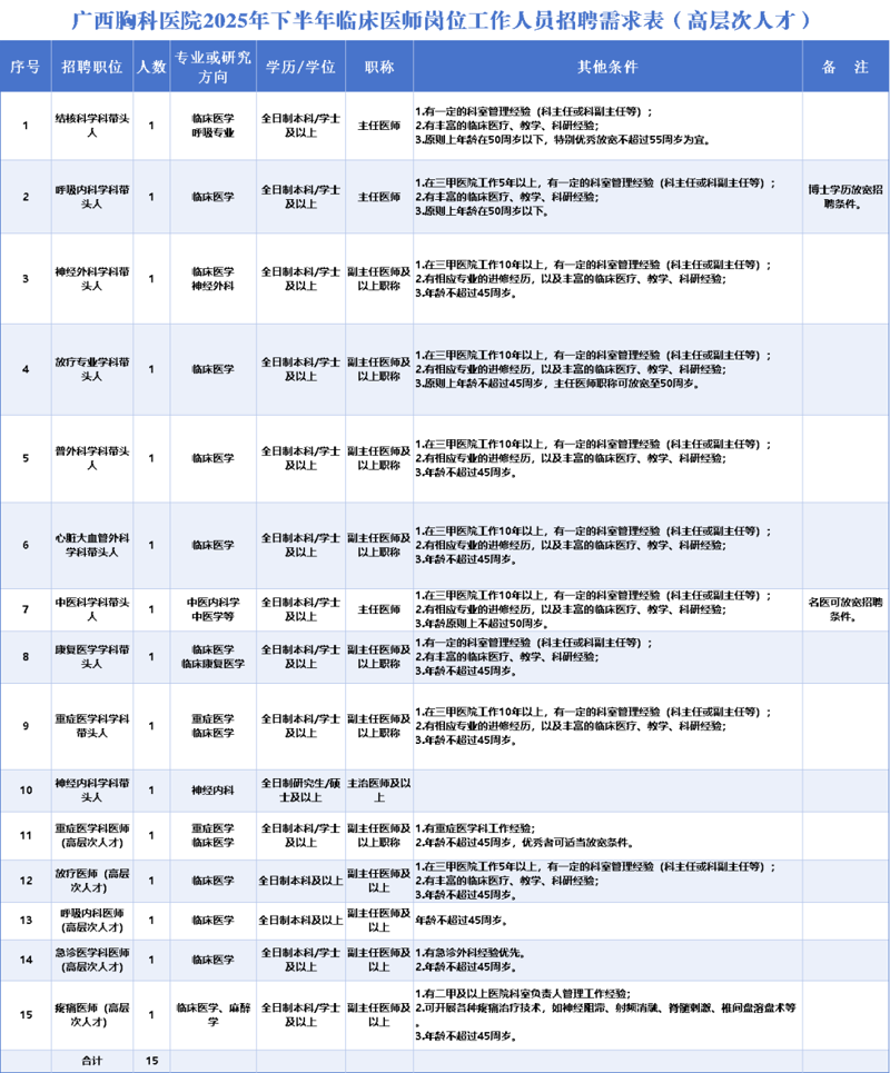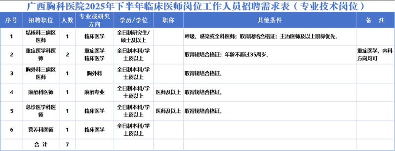 原文標題:廣西胸科醫院2025年下半年臨床醫師崗位工作人員招聘公告