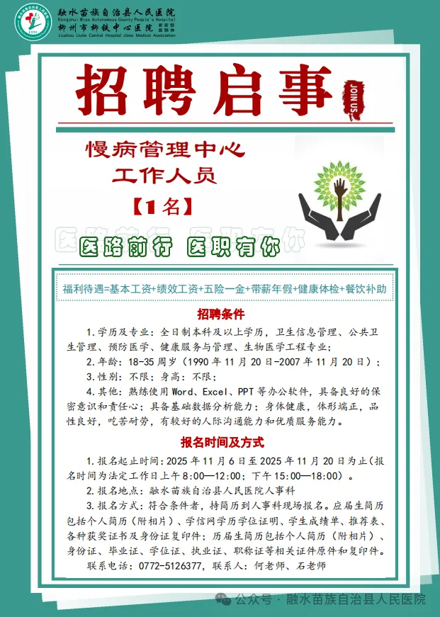 原文標題:融水苗族自治縣人民醫院招聘慢病管理中心工作人員1名