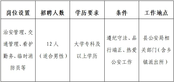 此次招聘的輔警屬勞動(dòng)合同用工性質(zhì),由扶綏縣公安局統一招聘,安排在縣公安局相關(guān)部門(mén)(具體職位安排如下)。