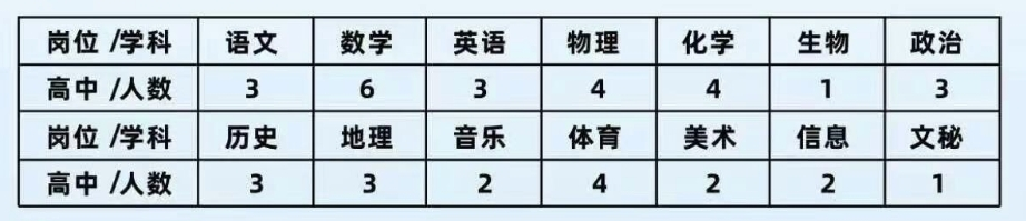 學(xué)校于2023年9月1日正式開(kāi)學(xué),現有30個(gè)行政班,一千余名學(xué)生,專(zhuān)任教師128人,發(fā)展勢頭強勁。為適應學(xué)校未來(lái)發(fā)展需要,特面向全國師范類(lèi)畢業(yè)生擇優(yōu)招聘青年教師若干,詳情如下: