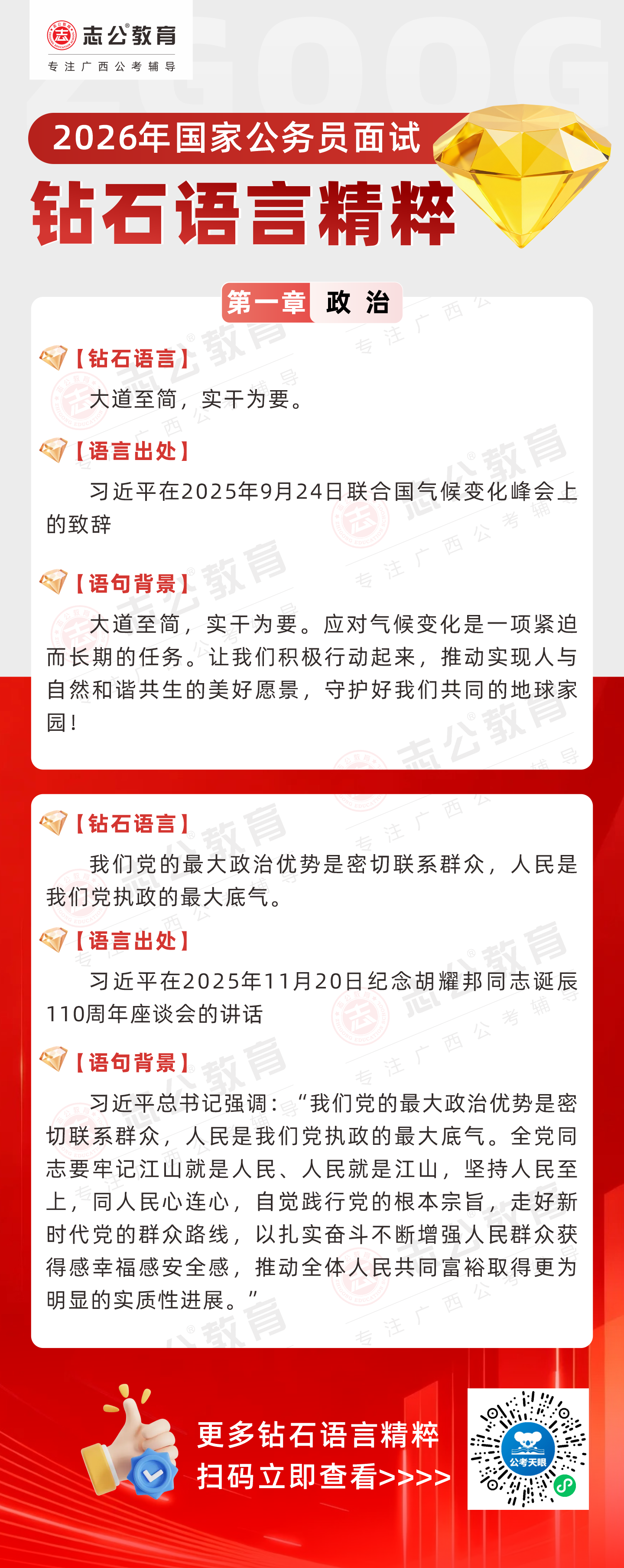 志公教育推出《2026國家公務(wù)員面試·鉆石語言精粹》政治篇!幫助考生把握政治類題目應(yīng)答邏輯,提升語言表達(dá)層次,助你在面試中脫穎而出。備考2026國考面試,從掌握“鉆石語言”開始!